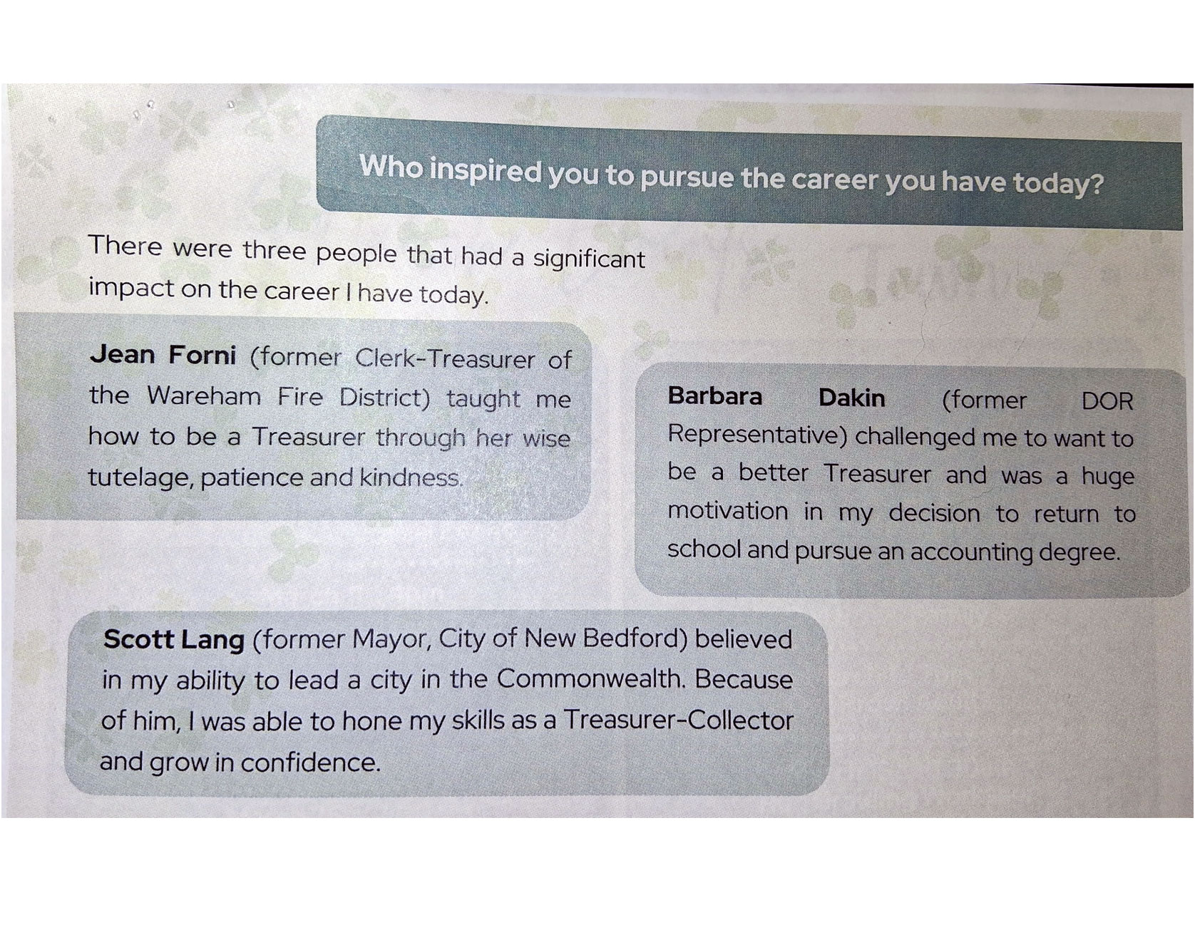 I have spent over 25 years of my career providing financial and administrative support to many municipalities throughout southeastern Massachusetts and Cape Cod. I was honored to spend 15 of those years as the Treasurer-Collector for the City of New Bedford. I had the opportunity to help many residents in many different ways – connecting, guiding, advocating, recommending and referring people to services and resources. My role as Treasurer-Collector extended beyond crunching numbers, it was always my pleasure to serve the citizenry and help when I could.